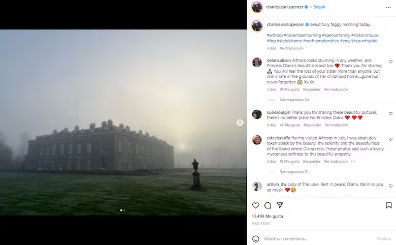 En la imagen se pudo ver a la imponente casona cubierta por una capa gris y oscura que sorprendió a más de uno y hasta fue advertido por Charles Spencer. “Hermosa mañana de niebla hoy”, escribió en el posteo. Asimismo, agregó una segunda imagen del lago que está en las inmediaciones del sitio donde descansan los restos de la princesa de Gales. En ella también se pudo ver cómo la neblina invadía West Northamptonshire.